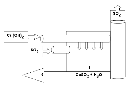 1. Kalciumhydroxiden rinner ner över svaveldioxiden. 2. Gipslösningen leds ut för att torkas. 3. Den återstående svaveldioxidmängden leds ut genom en skorsten. Observera att endast 5% av den ursprungliga svaveldioxidmängden återstår. Svavelutsläpp kan även minskas med en sk. virvebäddsmetod som går ut på att blåsa in luft då man förbränner en blandninga av stenkol och kalksten. Denna process binder svaveldioxiden till kalciumsulfat.