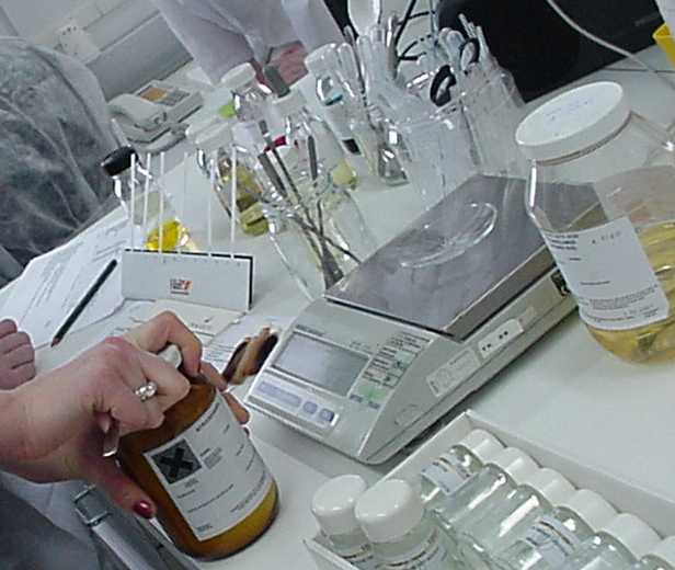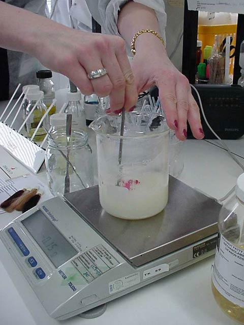 282g vettä (liuotin) Työn suoritus: Taaraa dekantterilasi. Kuumenna vesi lähes kiehuvaksi. Liuota metyhylparaben ja propyl paraben kuumaan veteen ( 85 C ). Lisää cetrimoniumkloridi veteen. Sekoita hyvin. Lisää setyylialkoholi n. 80-85:ssä, ja pidä lisäyksen jälkeen lämpöyila vakiona n. 10-15 minuutin ajan, sekoita koko ajan. Lisää glyseriini ja sekoita. Anna jäähtyä huoneen lämpötilaan, kokoajan sekoittaen. Lisää hajuste ja väri ja sekoita. Tarkista haihtuneen veden määrä, lisää tarvittaessa. Mittaa tuotteen pH. Jos pH ei ole rajoissa, lisää pienin erin sitruunahappoa ja säädä pH. Kun pH on säädetty, mittaa viskositeetti. Viskositeetti voi muuttua ajan myötä, joten sitä täytyy seurata muutaman päivän ajan. |
