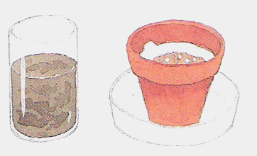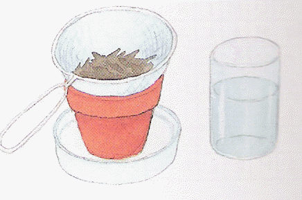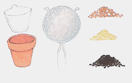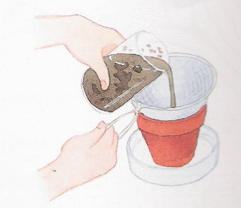 1. Pese kukkaruukku hyvin ja anna sen kuivua. Aseta se sitten laakeaan astiaan, vuoraa suodatinpaperilla ja täytä siitä kolmasosa puuhiilellä (tai grillihiilellä). Huuhdo hiekka juoksevassa vedessä ja painele sitä märkänä hiilikerroksen päälle toisen kolmanneksen verran. Pese lopuksi sora ja täytä sillä suodatinpaperi loppuun asti.